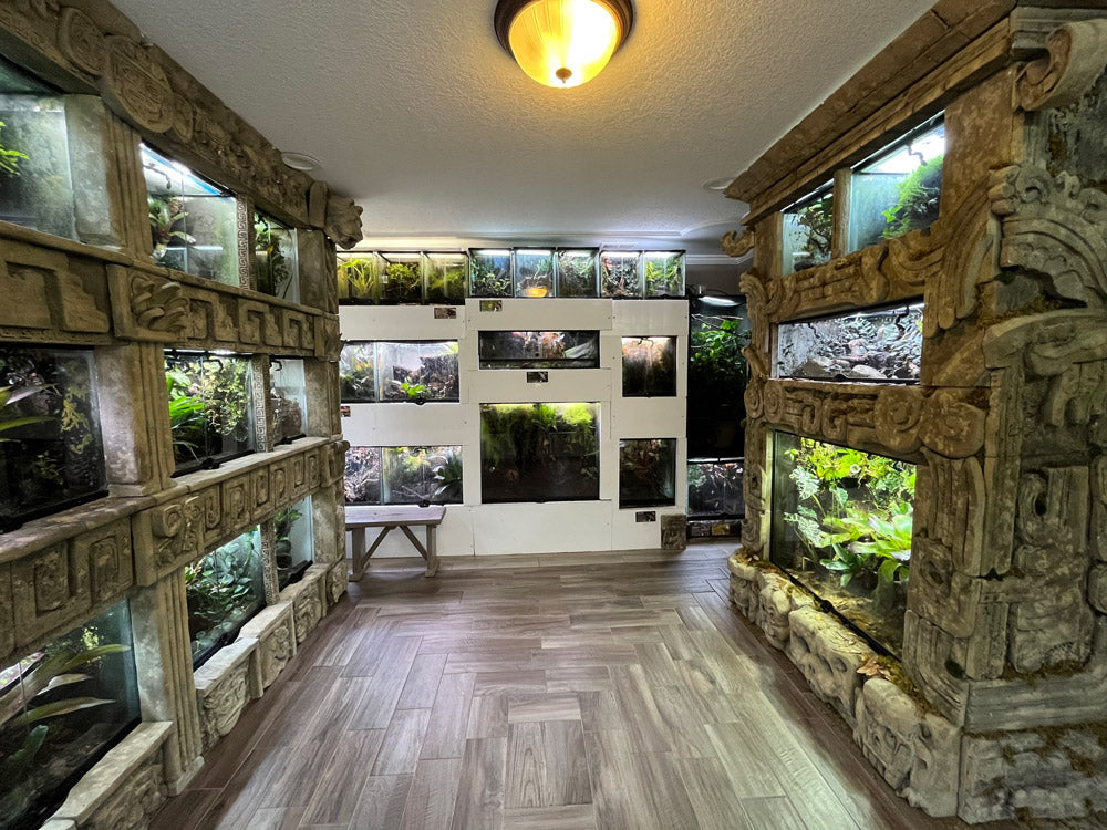 On top of all this, I'm also working full-time as the Vice President of Marketing for a 3D fabrication company. We specialize in crafting props and displays using foam and various materials. Interestingly, this job has kindled another passion of mine: sculpting and creating physical props. You can see some of my creations, like the Aztec ruins adorning my vivariums in the frog room, as well as a range of mossariums, faux mushrooms, bamboo poles, rocks, and decor that aims to be both visually appealing and functional, with a natural aesthetic. I hope to offer more of these types of products some day.