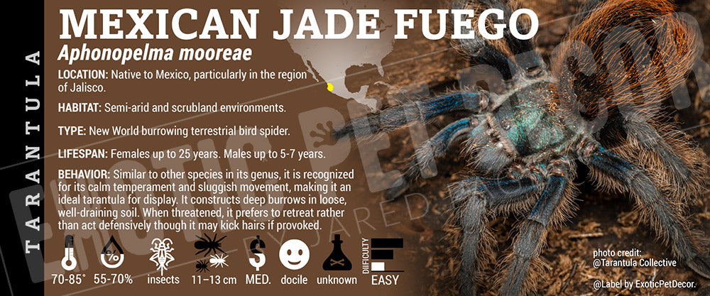 Aphonopelma mooreae 'Mexican Jade Fuego' Tarantula label